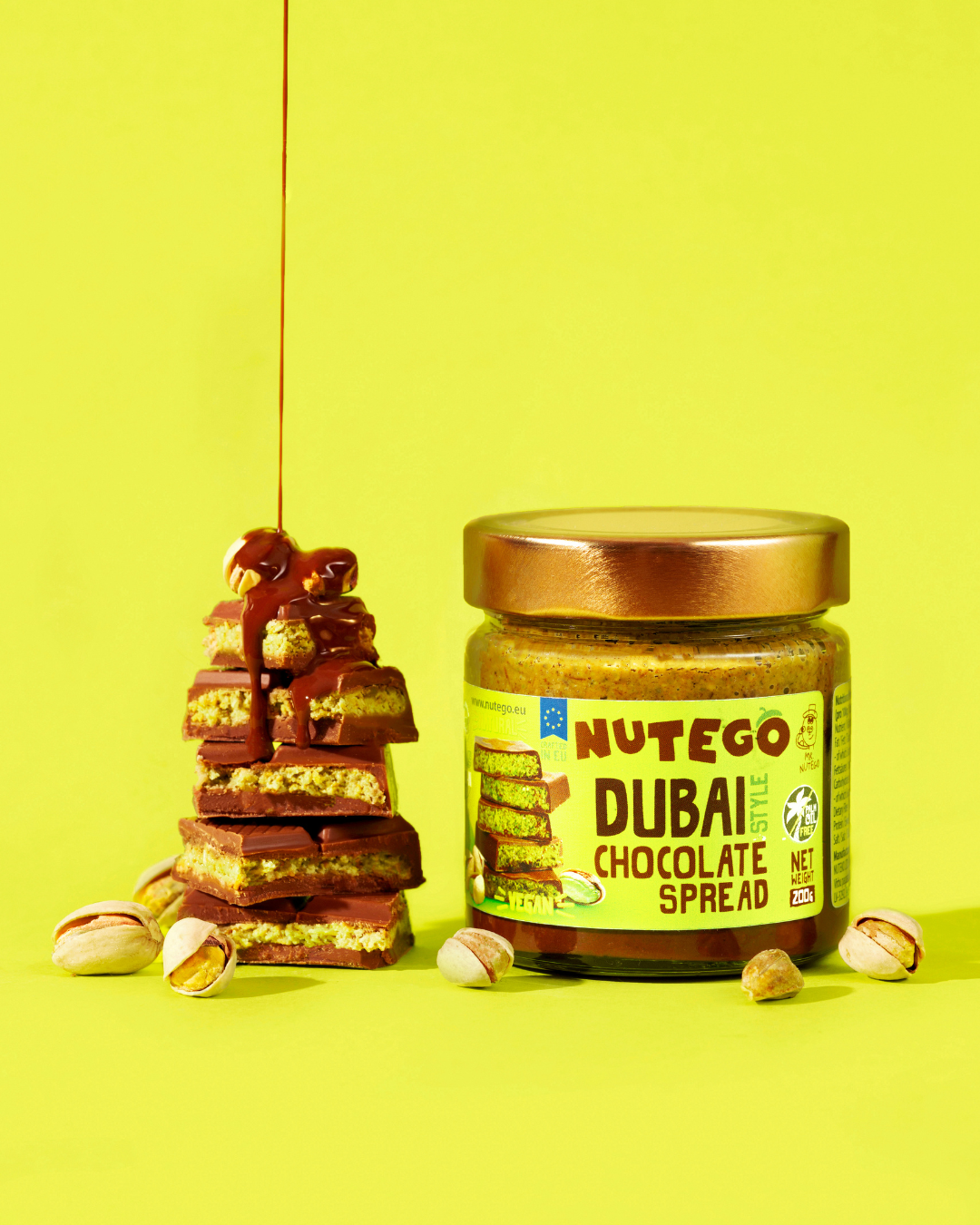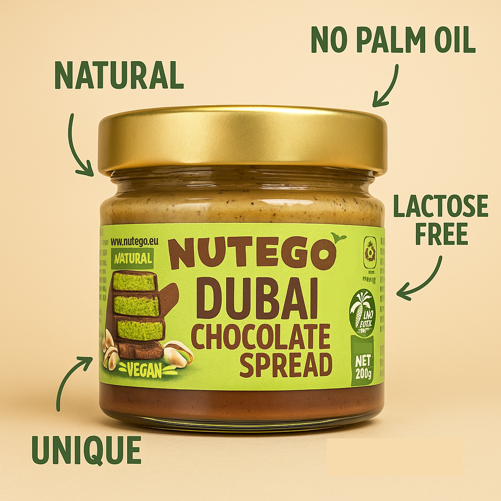 NUTEGO Dubai Style Chocolate Spread ist eine NATÜRLICHE luxuriöse Mischung aus belgischer Schokolade, reichen Haselnüssen und samtiger Pistazienpaste – verfeinert mit einem zarten Crunch aus goldener Kataifi-Teig. Dieses 200g Meisterwerk ist eine mutige, moderne Wendung der östlichen Verwöhnung.