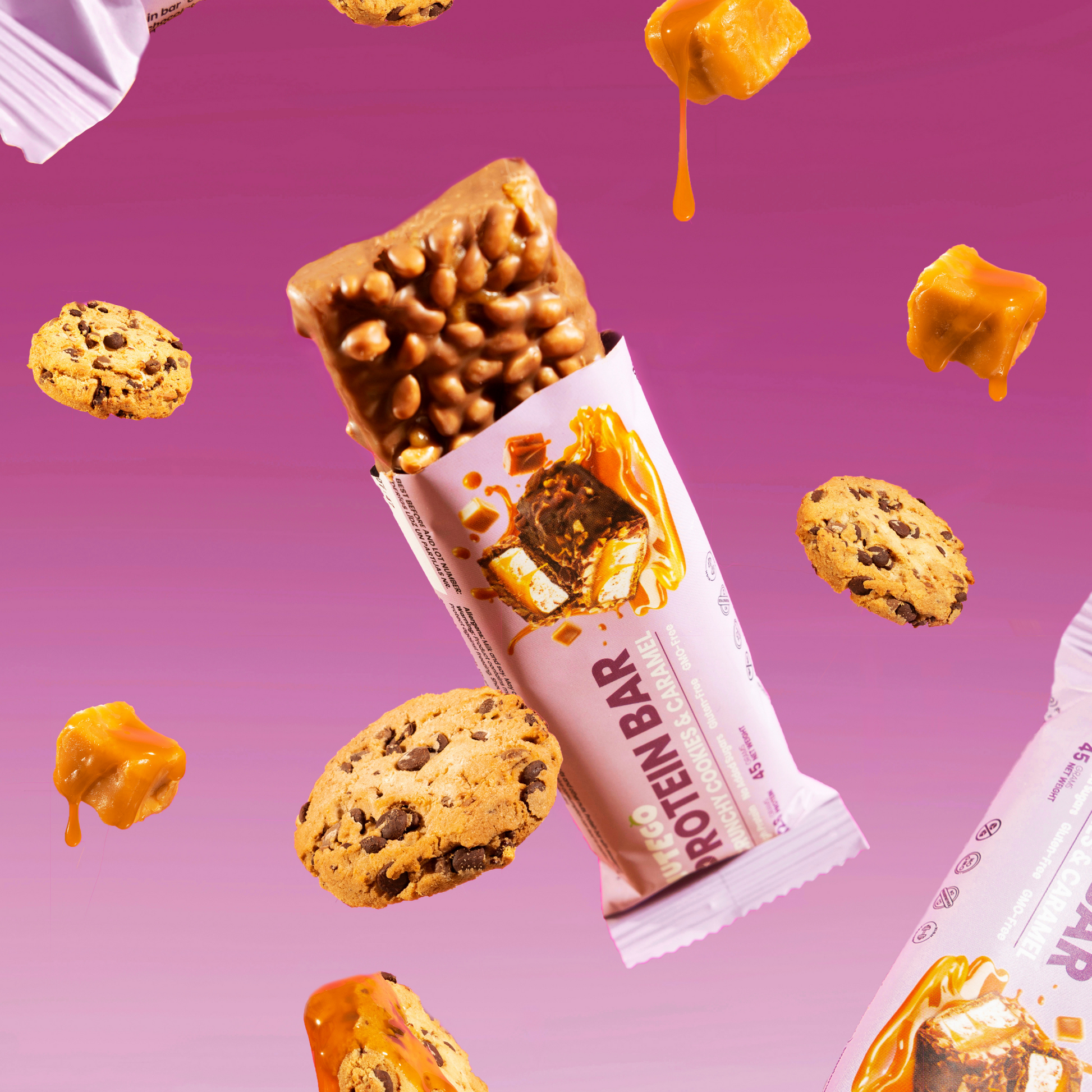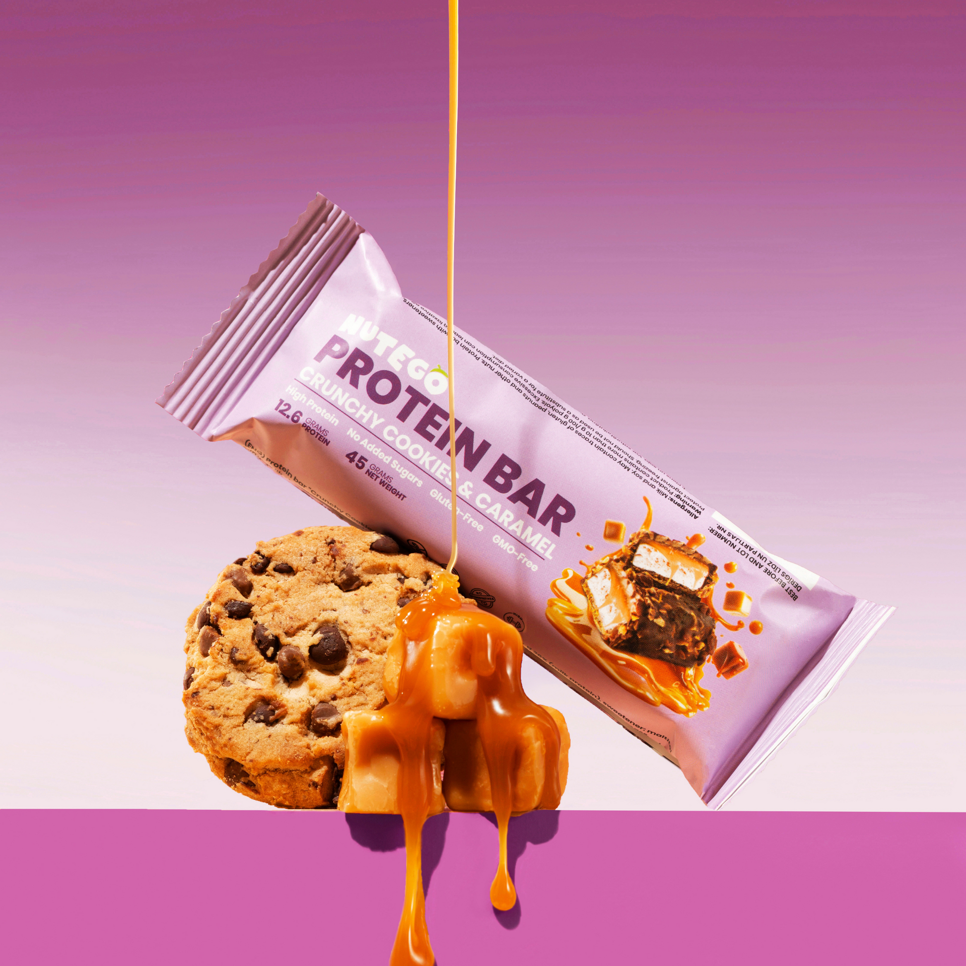 NUTEGO Proteinriegel „Crunchy Cookies & Caramel“ ist dein Lieblingssnack. Mit einer köstlichen Karamellschicht, knusprigen Soja-Crispies und keksähnlicher Textur, alles eingehüllt in zarte Vollmilchschokolade aus Rainforest Alliance-zertifiziertem Kakao – es ist Genuss auf Dessertniveau mit funktionalen Vorteilen.