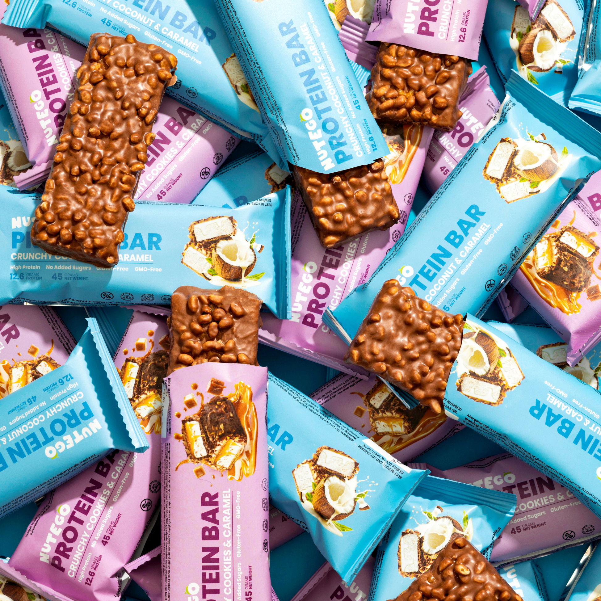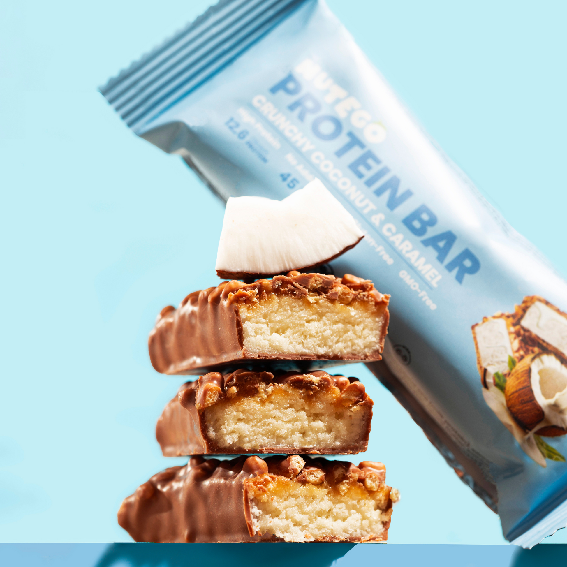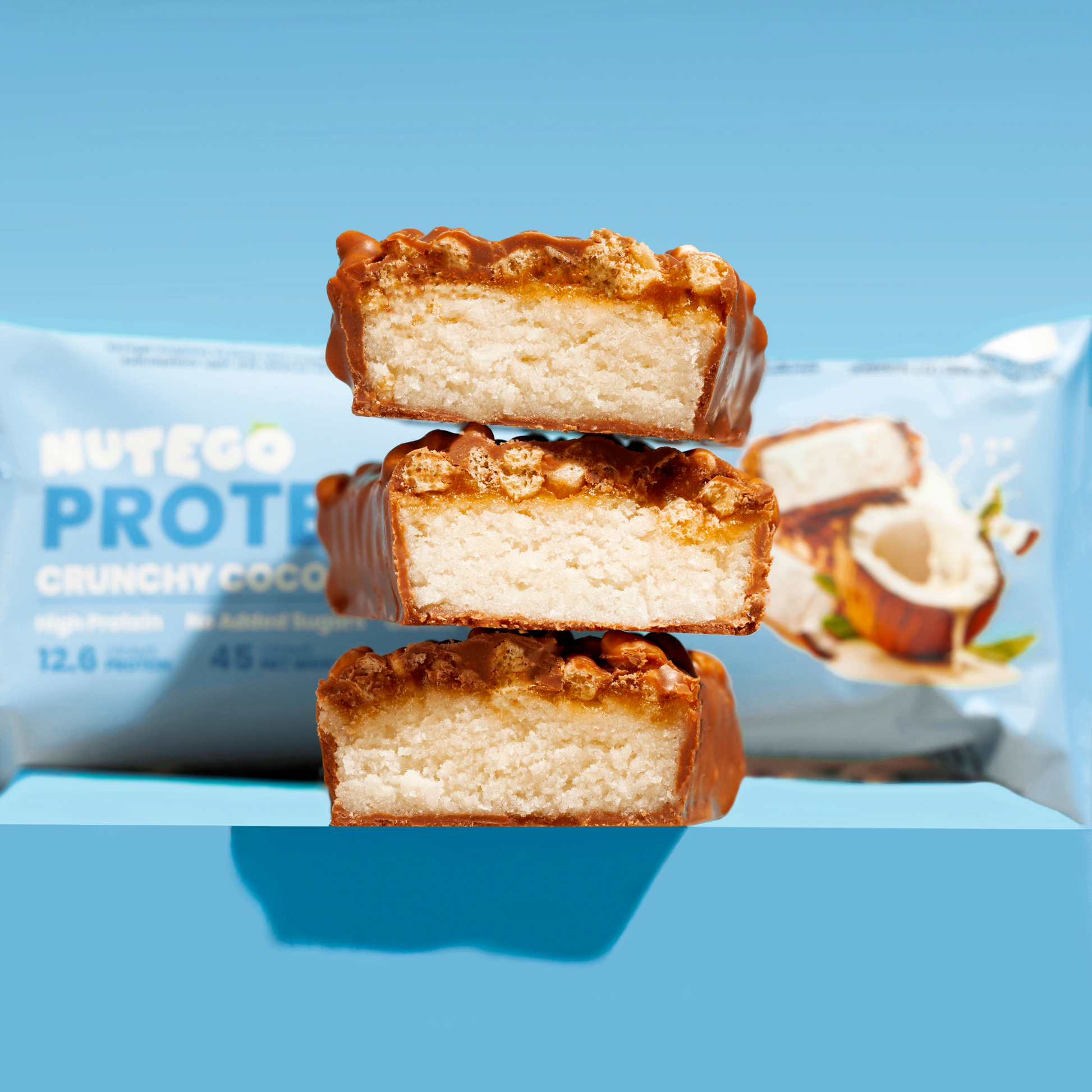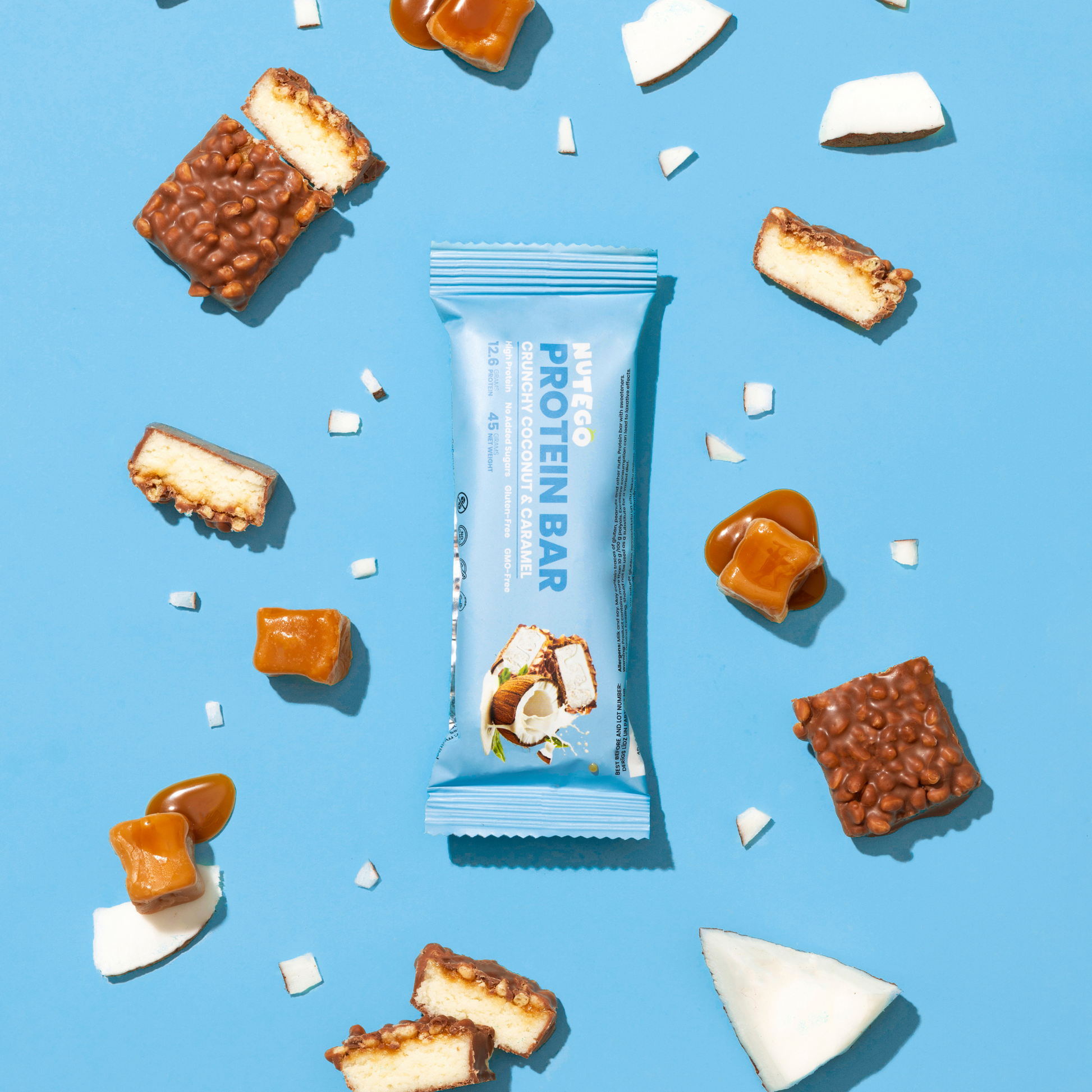 Der NUTEGO Protein Riegel „Crunchy Coconut & Caramel“ bietet genau das – eine köstliche Kombination aus cremigem Karamell, knusprigem Sojaprotein und echten Kokosflocken, alles eingehüllt in zarte Vollmilchschokolade aus Rainforest Alliance-zertifiziertem Kakao.